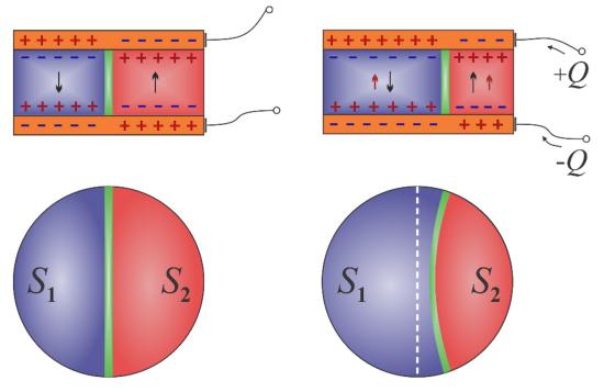 | This image shows the motion of the domain wall (ac and bd) in a capacitor when a charge is added to one side (c). The resulting redistribution of the domain wall causes a negative capacitive effect |