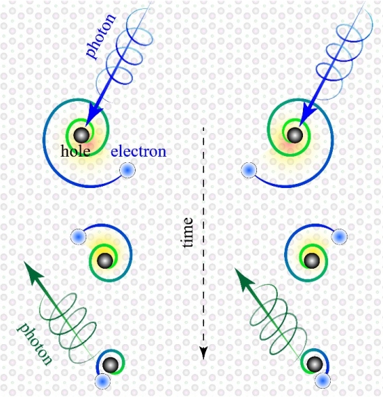 The electrons and gaps generated in this process resemble fast spinning rods. Electrons (negative charges) eventually "spiral" into gaps (positive charges), annihilating each other in less than a trillionth of a second, which results in the emission of a type of light called photoluminescence .