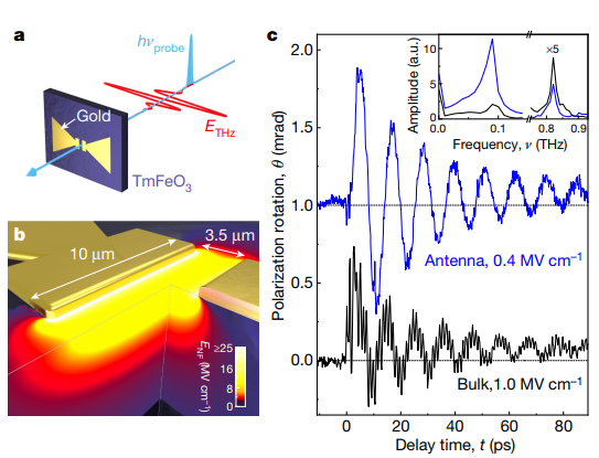 | The necktie structure acts as an antenna to capture the T rays and change the state of the spin. [Image: Schlauderer et al. - 10.1038 / s41586-019-1174-7] |