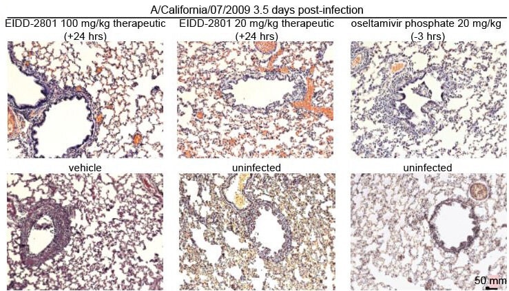 | Analyzes showing a reduction in viral load in the ferret, 3.5 days after infection; the comparison is made between EIDD-2801 and oseltamivir. Credits: Mart Toots et al. 2019 |