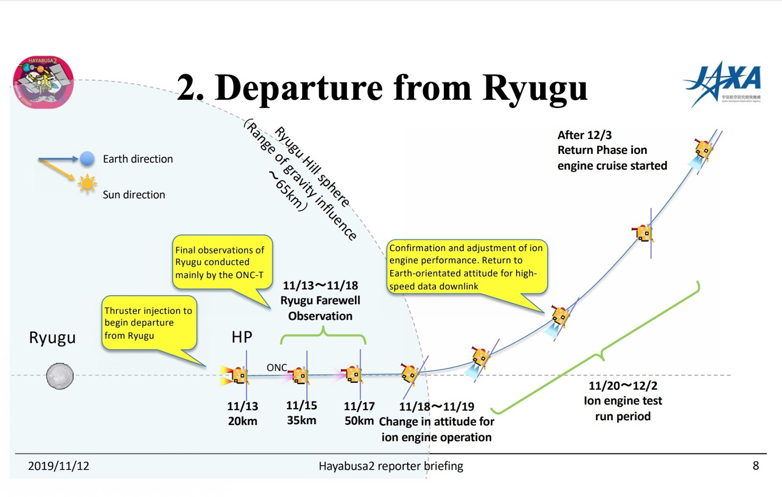 For the spacecraft, the long return journey began Wednesday, Nov. 13, 2019, and is expected to reach Earth "by the end of 2020," said Japan Aerospace Exploration Agency (JAXA).