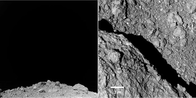 | The surface of the asteroid Ryugu, photographed in detail by the Hayabusa-2 probe at 64 and 67 meters altitude. Credits: JAXA |