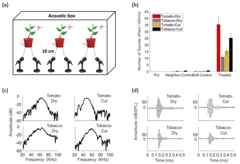 | Depending on the frequency and intensity of the sounds emitted, it is possible to identify the plant species and the stress they experience. Credits: I. Khait et al. 2019 |