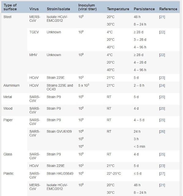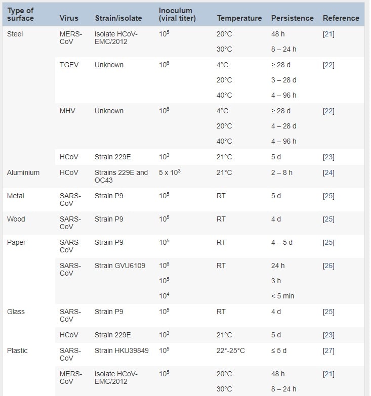 | Table showing the lifespan of different strains of coronavirus on several types of surfaces. Credits: Günter Kampf et al. 2020 |