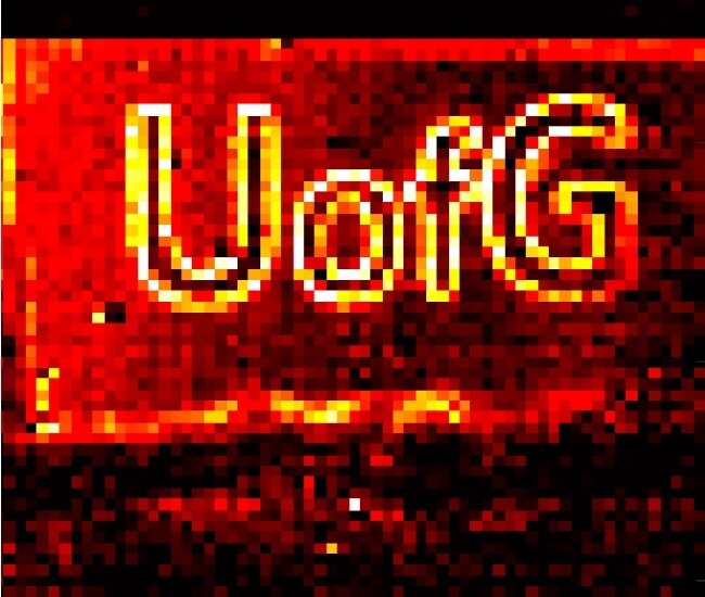 spelling 'UofG' etched onto a piece of glass at around 8 microns deep.