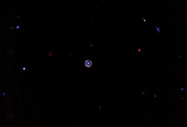 galaxy has been magnified and wrapped into an almost-perfect ring by a