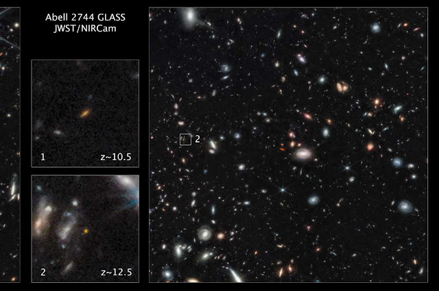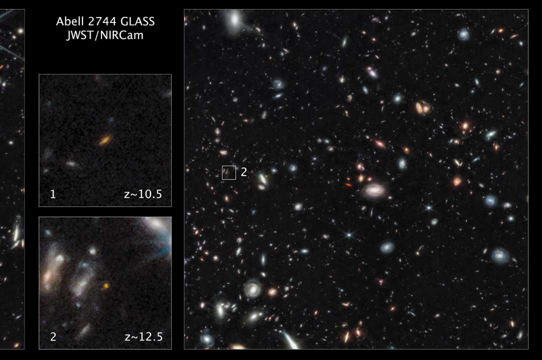 | Two of the most distant galaxies seen to date are captured in these Webb pictures of the outer regions of the giant galaxy cluster Abell 2744. |