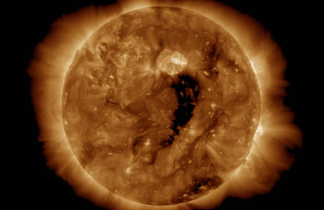 The coronal hole is a gigantic solar gulf stretching across the sun’s