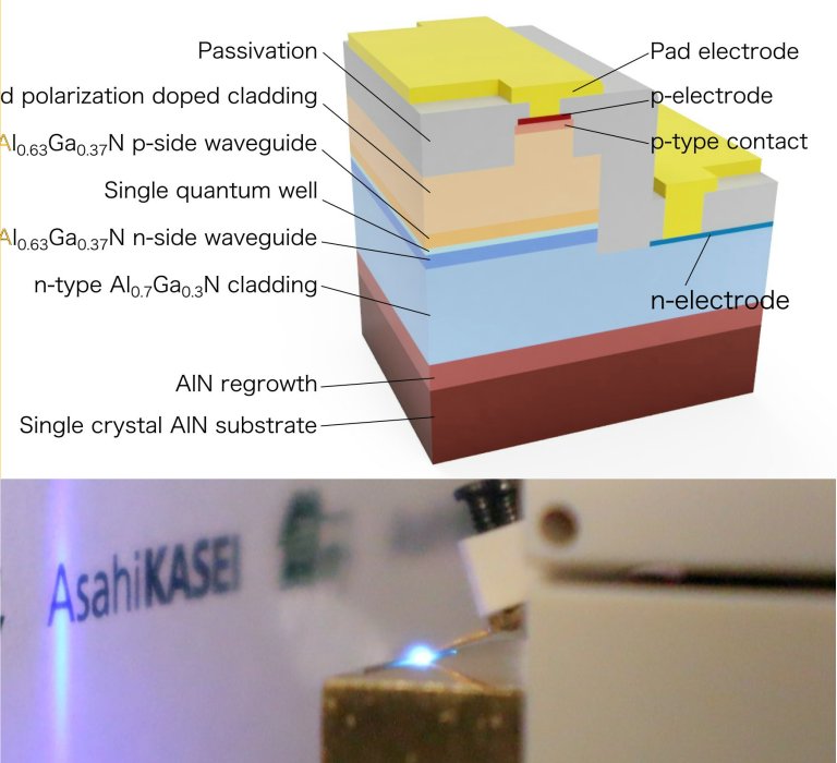 | Structure and prototype of the UV-C laser diode. [Image: Asahi Kasei Corp / Nagoya University] |