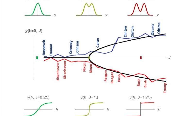 This long-term shift from a stable electoral situation to one marked by instability is similar to what happens with ferromagnetic metal exposed to a magnetic field, adds Siegenfeld, and can be described by the same mathematical formulas.