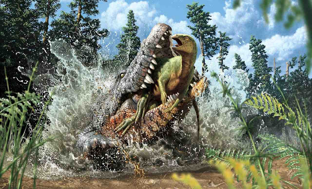 relative clamped down with its powerful jaws on the small body of a dinosaur